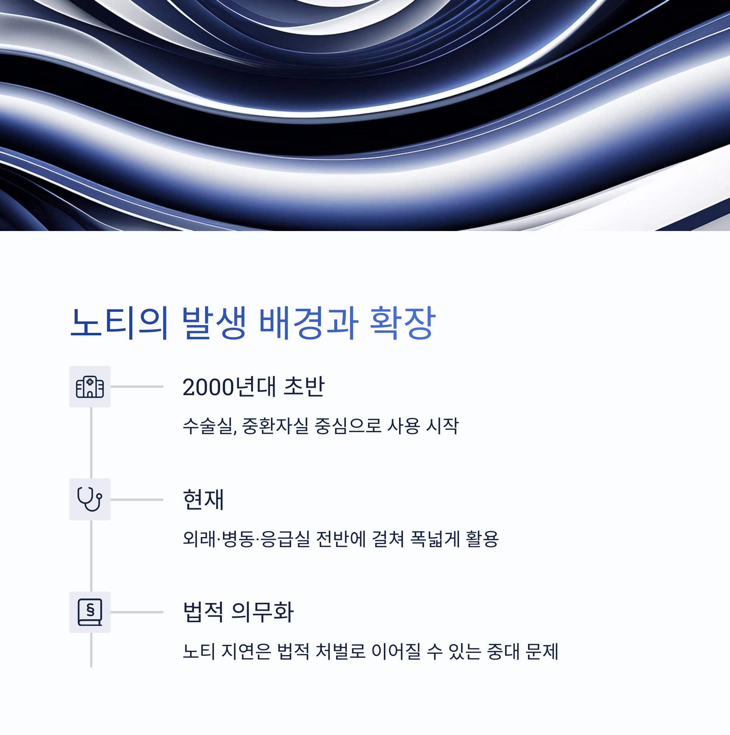 '노티'는 2000년대 초반부터 병원 조직 내에서 자연스럽게 자리잡은 의료 커뮤니케이션 약어입니다