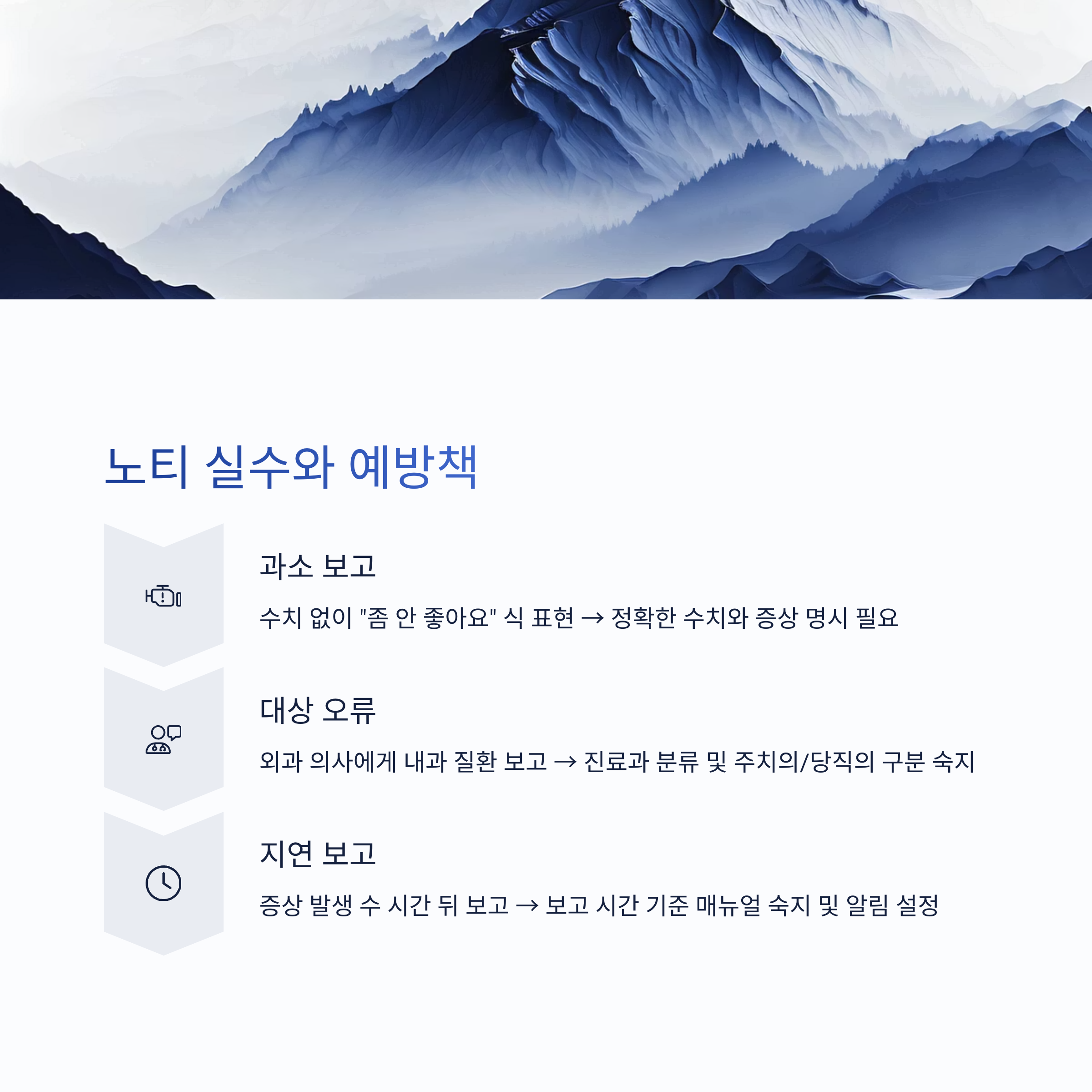 | 과소 보고 | 수치 없이 "좀 안 좋아요" 식 표현 | 정확한 수치와 증상 명시 필요 |
