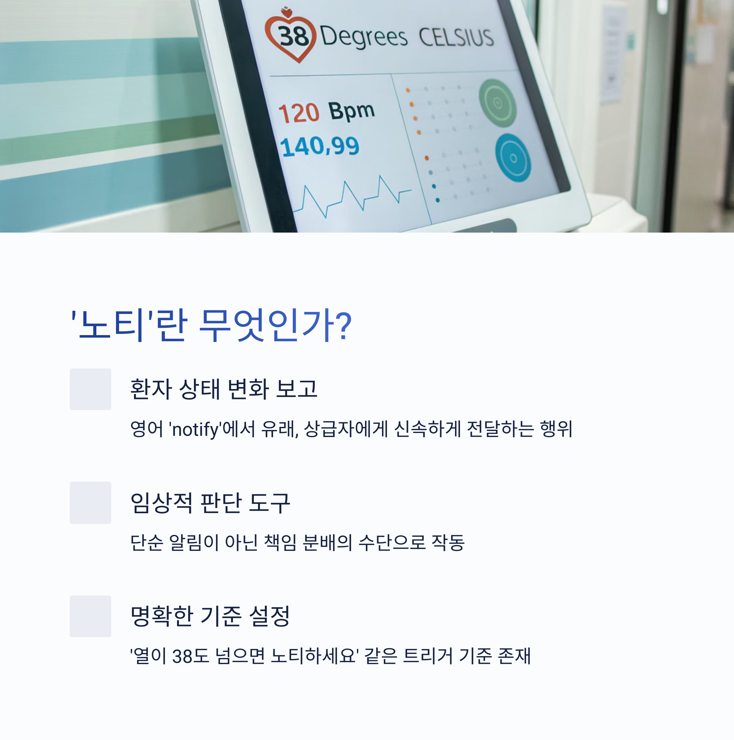 노티는 의료 현장에서 환자의 상태 변화나 이상 소견을 신속하게 상급자에게 전달하는 행위입니다