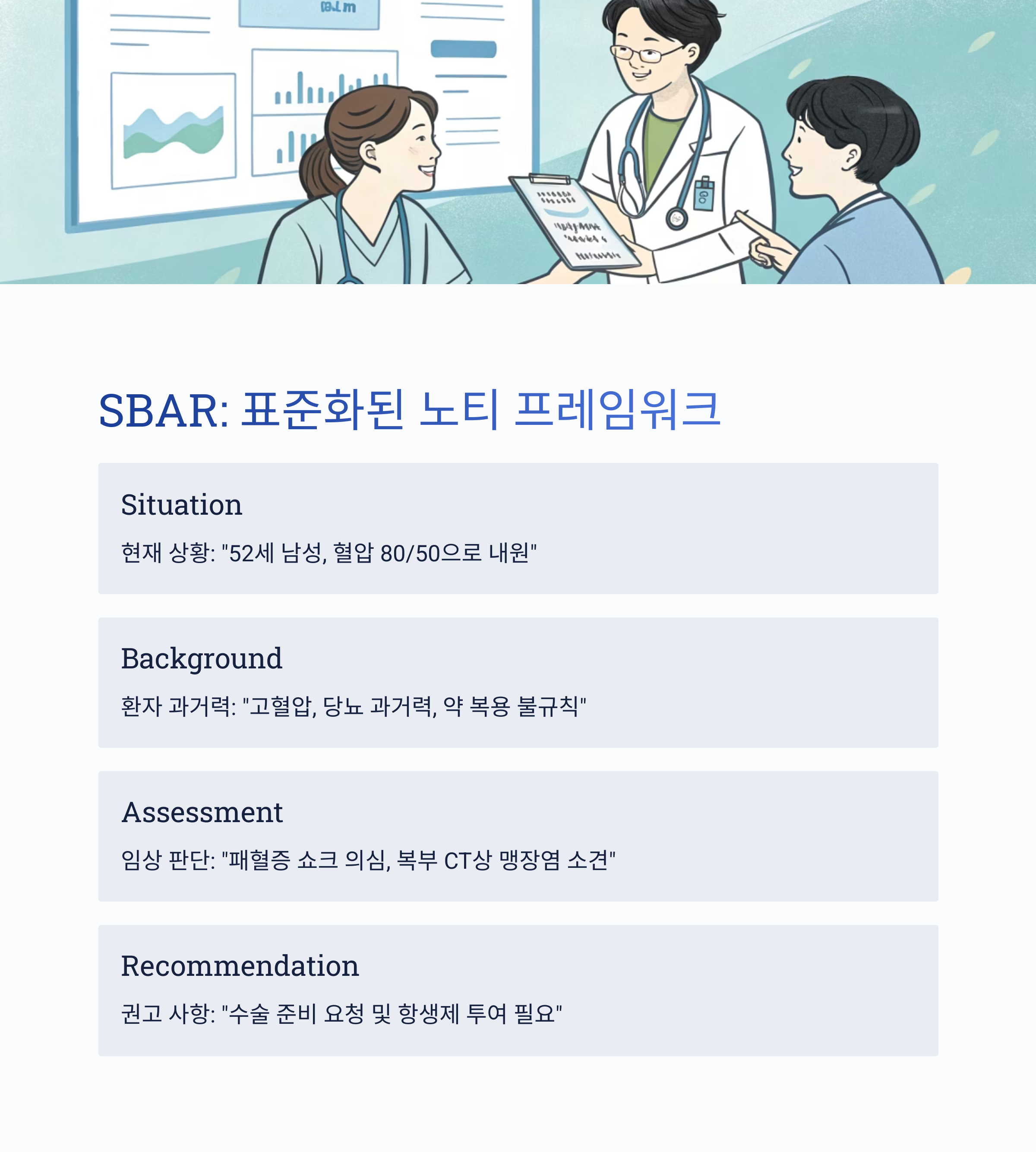 노티는 다음의 SBAR 프레임워크로 구성하면 정확성과 신뢰도를 높일 수 있습니다
