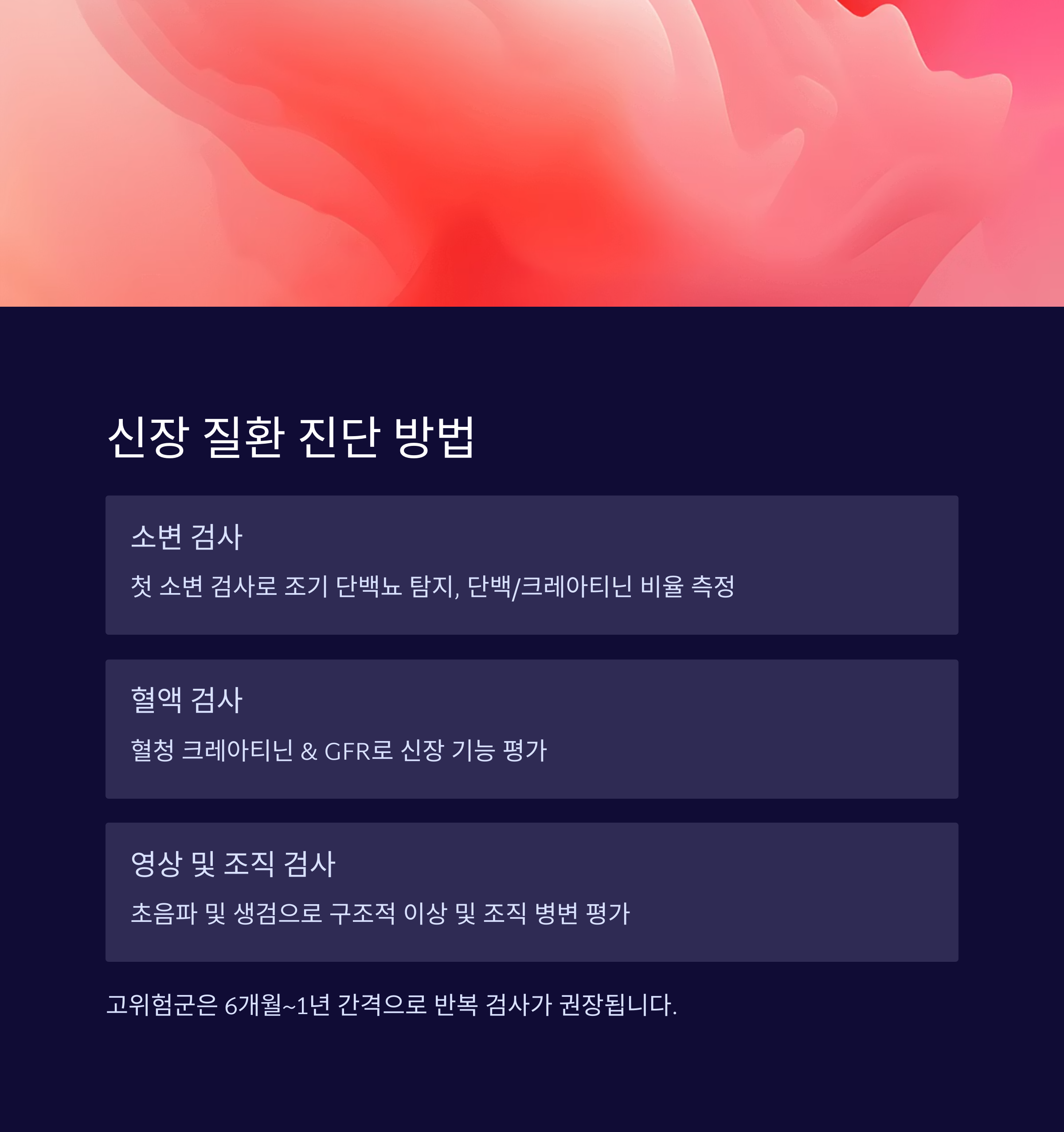 정확한 검사와 전문 상담을 통해 신장 건강을 지키는 한 걸음을 내딛어 보시기 바랍니다.