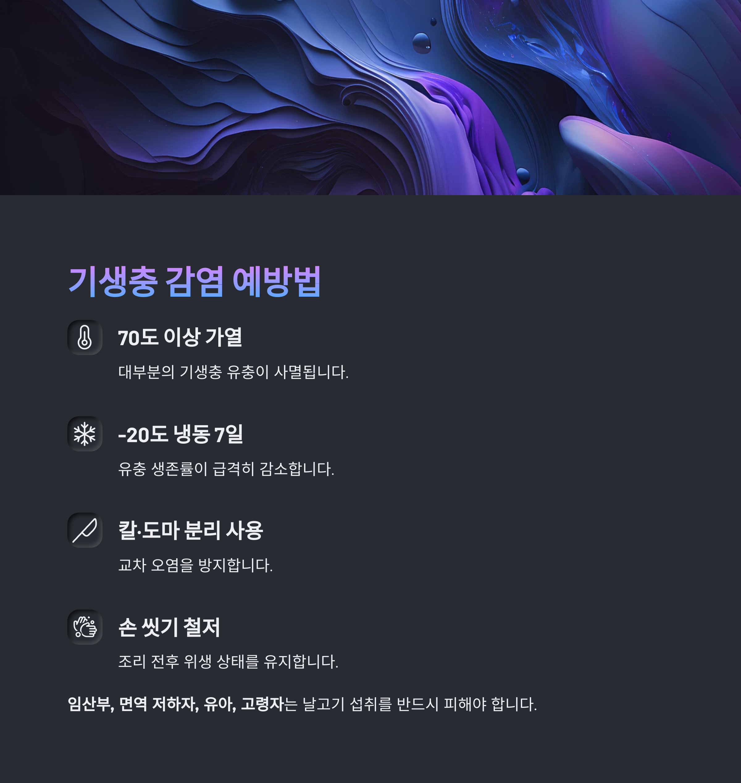 조리 전 위생 수칙을 철저히 지키고, 면역 취약자는 날고기 섭취를 자제해야 합니다.