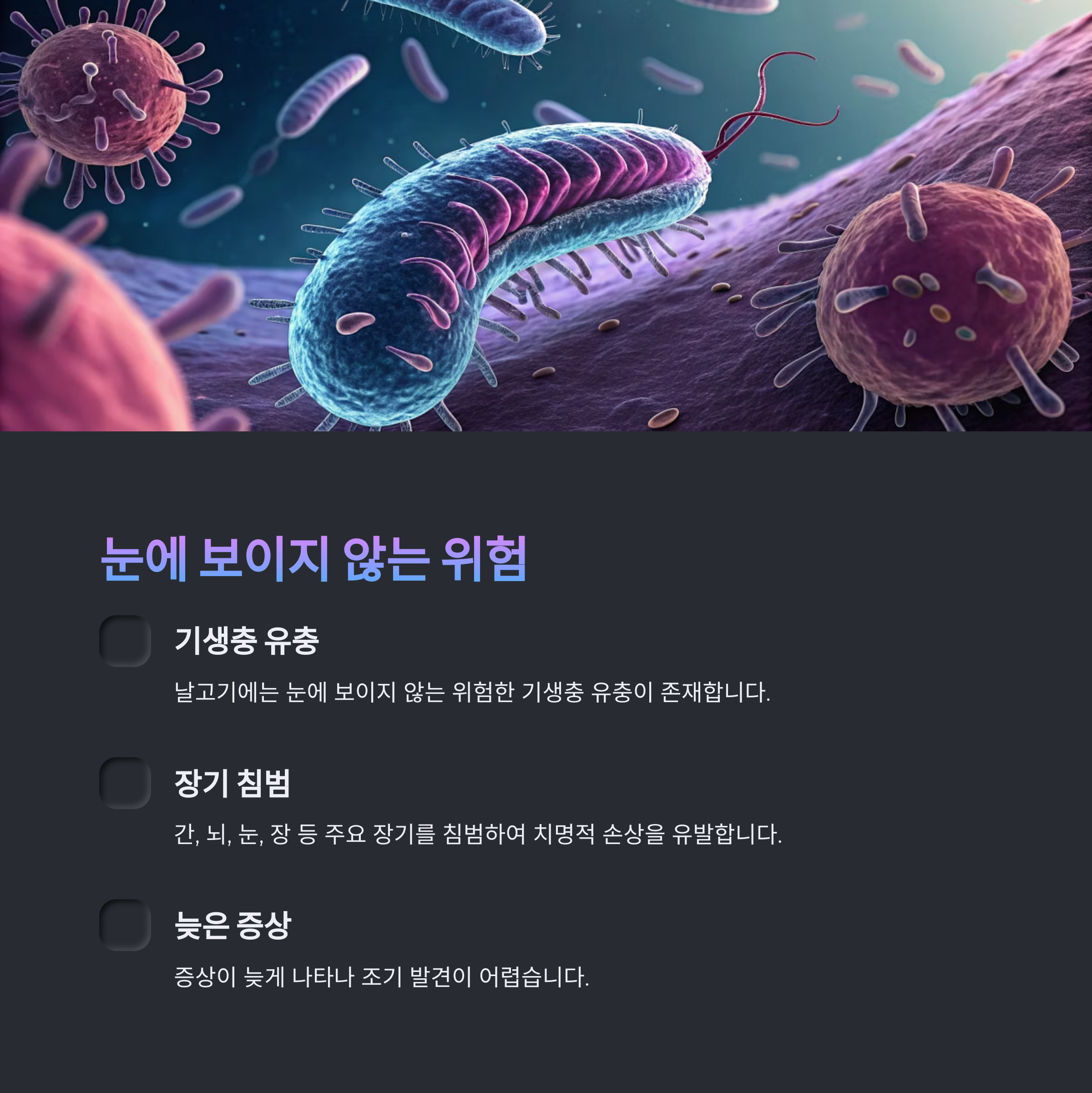 고온 조리 없이 섭취되는 날고기에는 눈에 보이지 않는 기생충 유충이 존재할 수 있습니다.