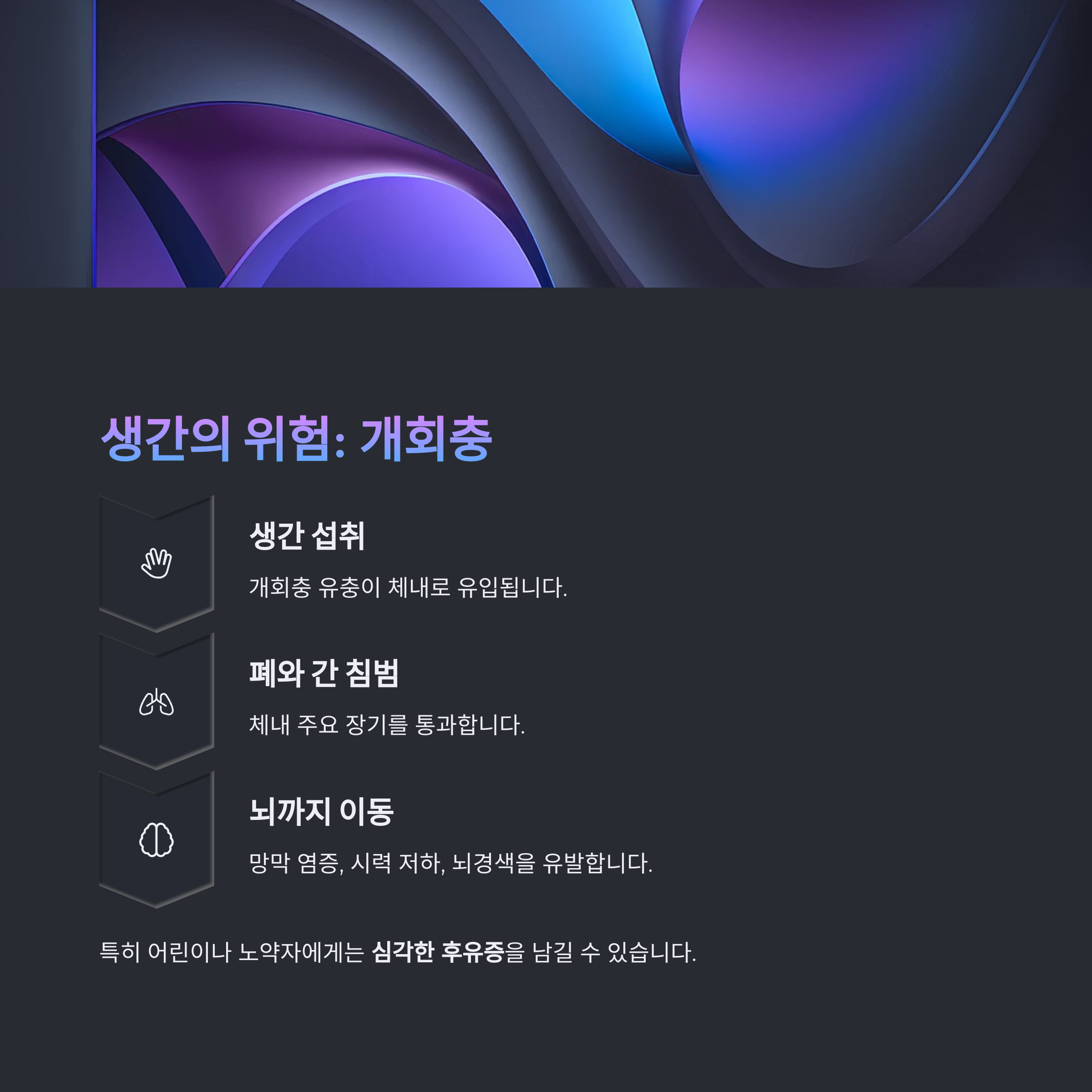 이 유충은 간, 뇌, 눈, 장 등 주요 장기를 침범하며 치명적인 손상을 유발합니다.