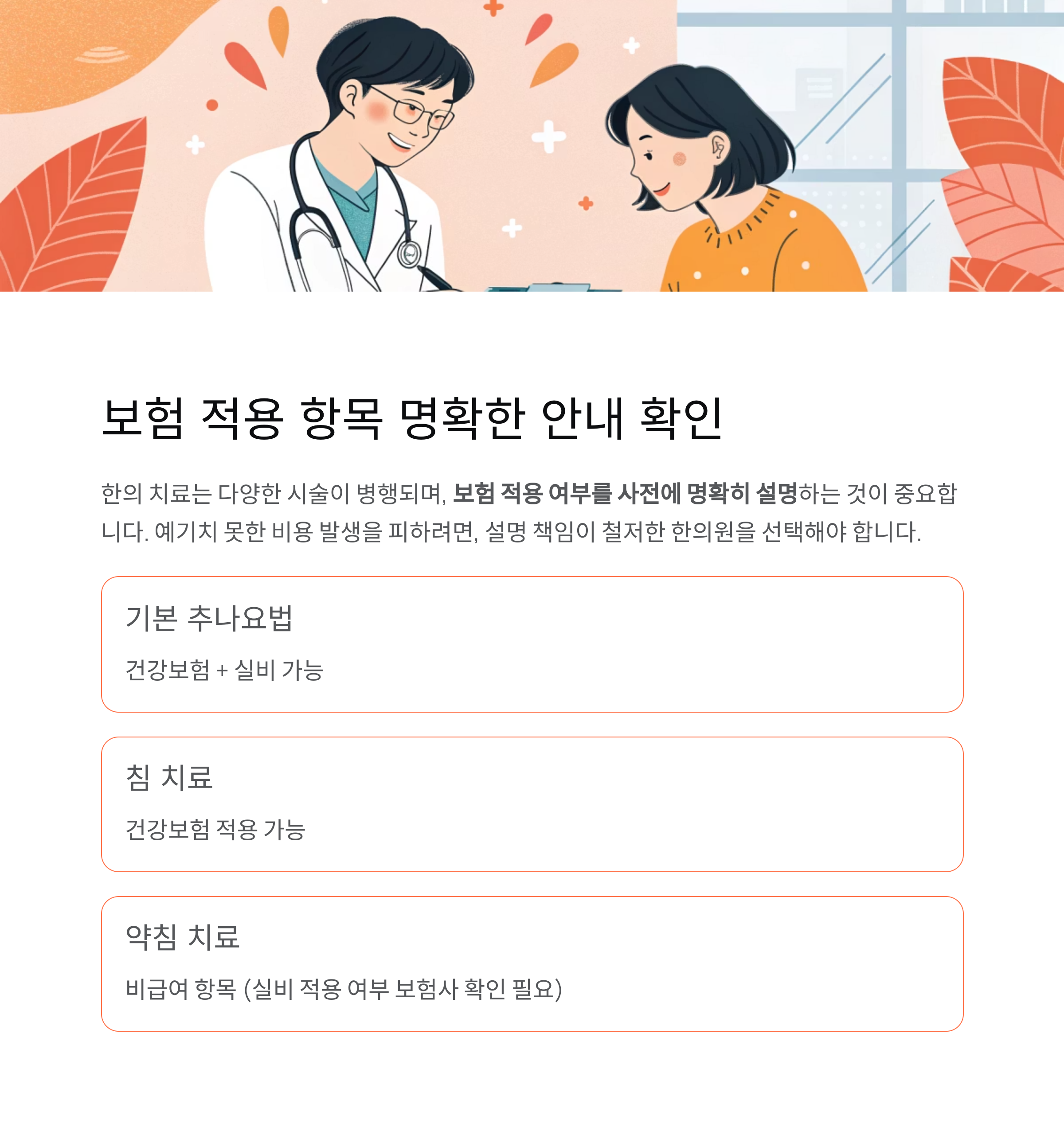 예기치 못한 비용 발생을 피하려면, 설명 책임이 철저한 한의원을 선택해야 합니다.